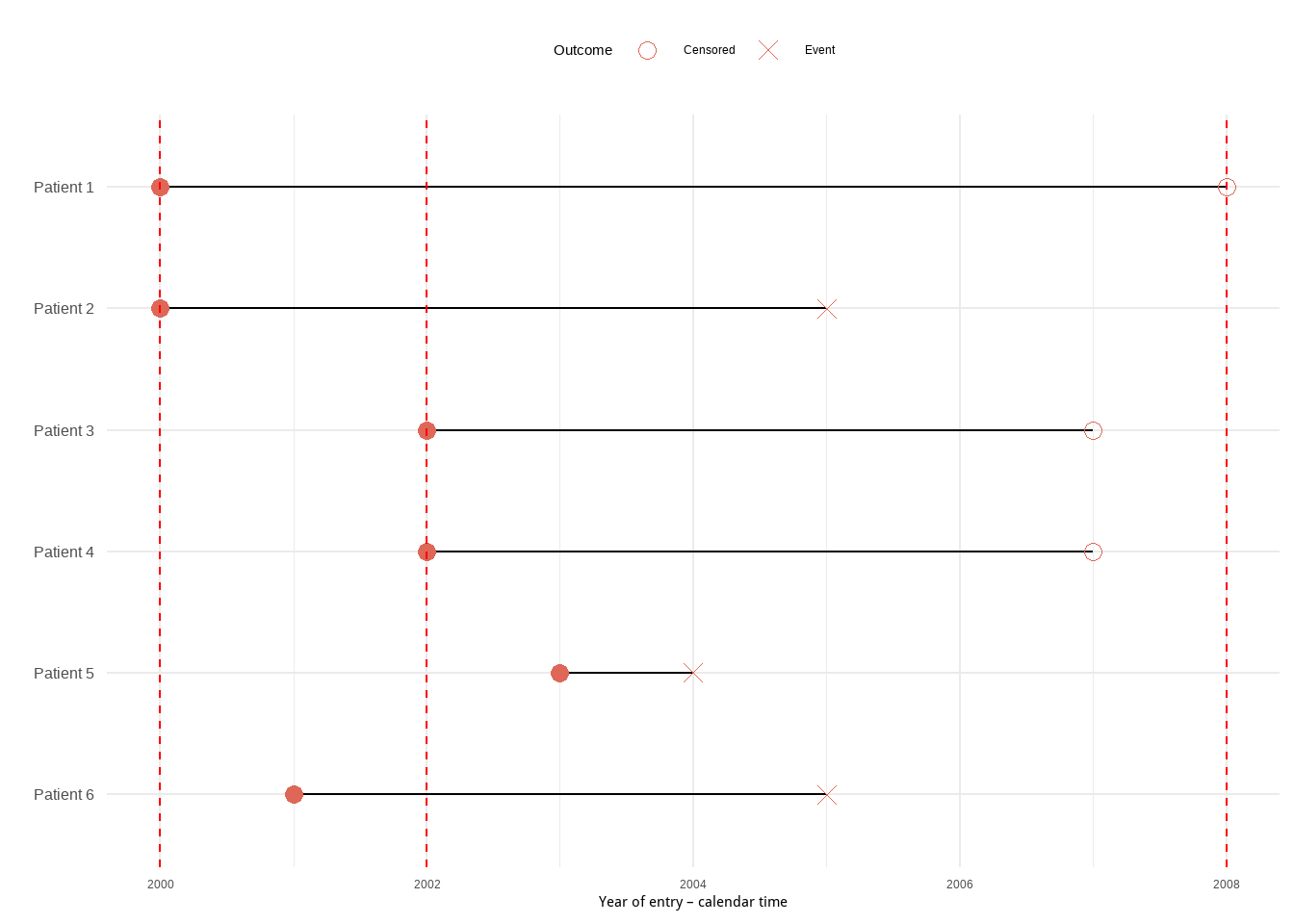 Exit = c(2008, 2005, 2007, 2007, 2004, 2005), # Year of follow-up end