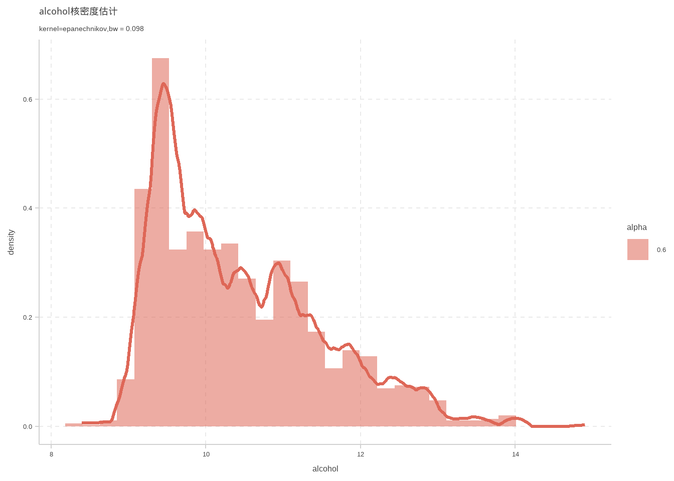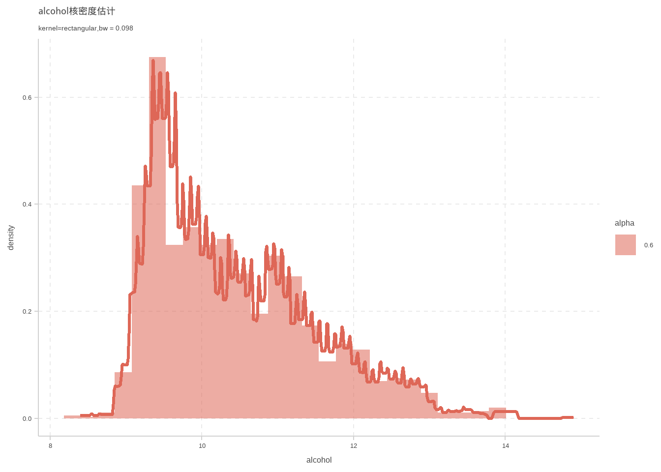 d %>% ggplot(aes(x = alcohol)) +geom_density(kernel ="rectangular",size=1.1,bw=bw.SJ(d$alcohol))+labs(