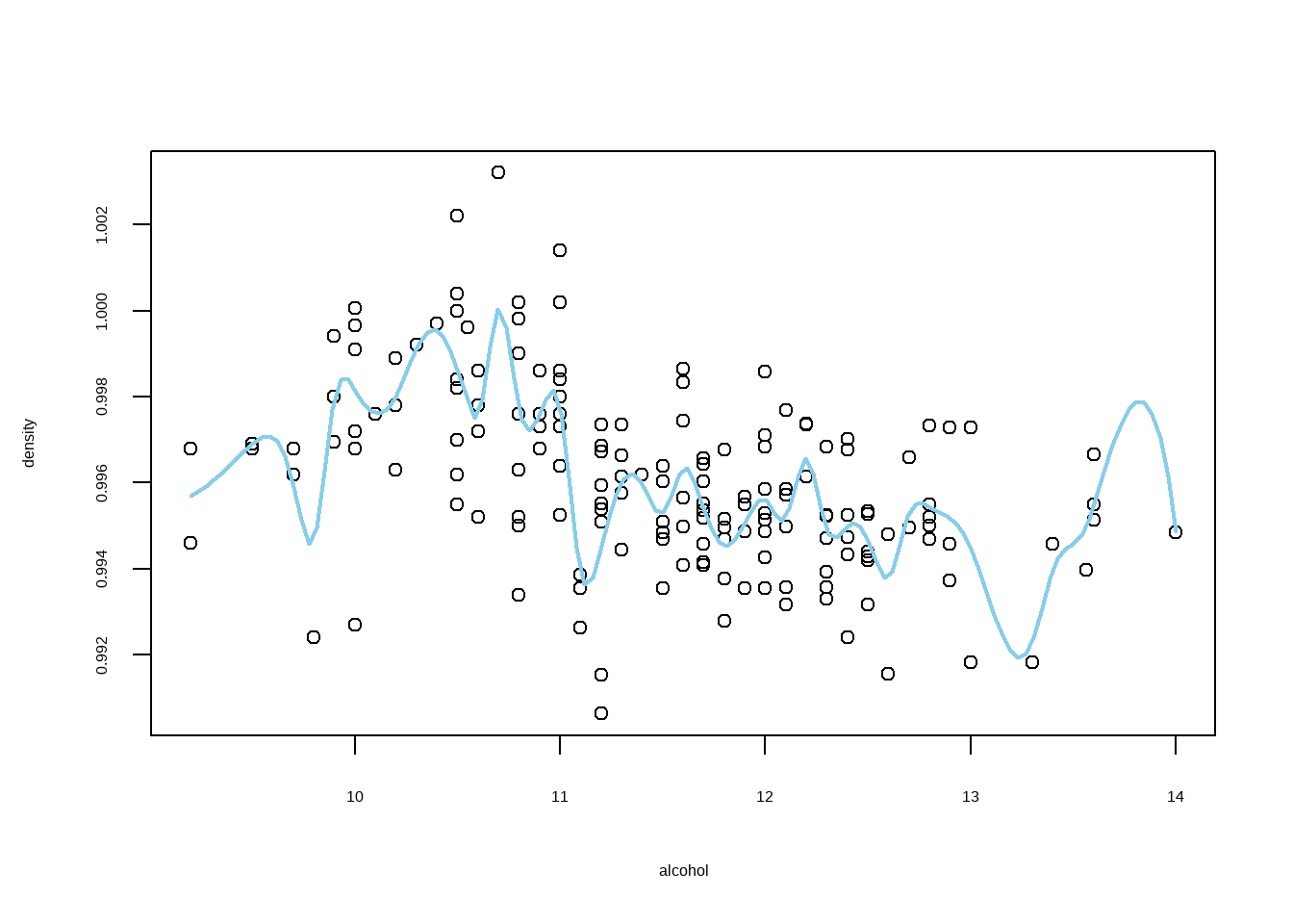 points(d %>% select(alcohol,density),cex=0.1,pch=5)