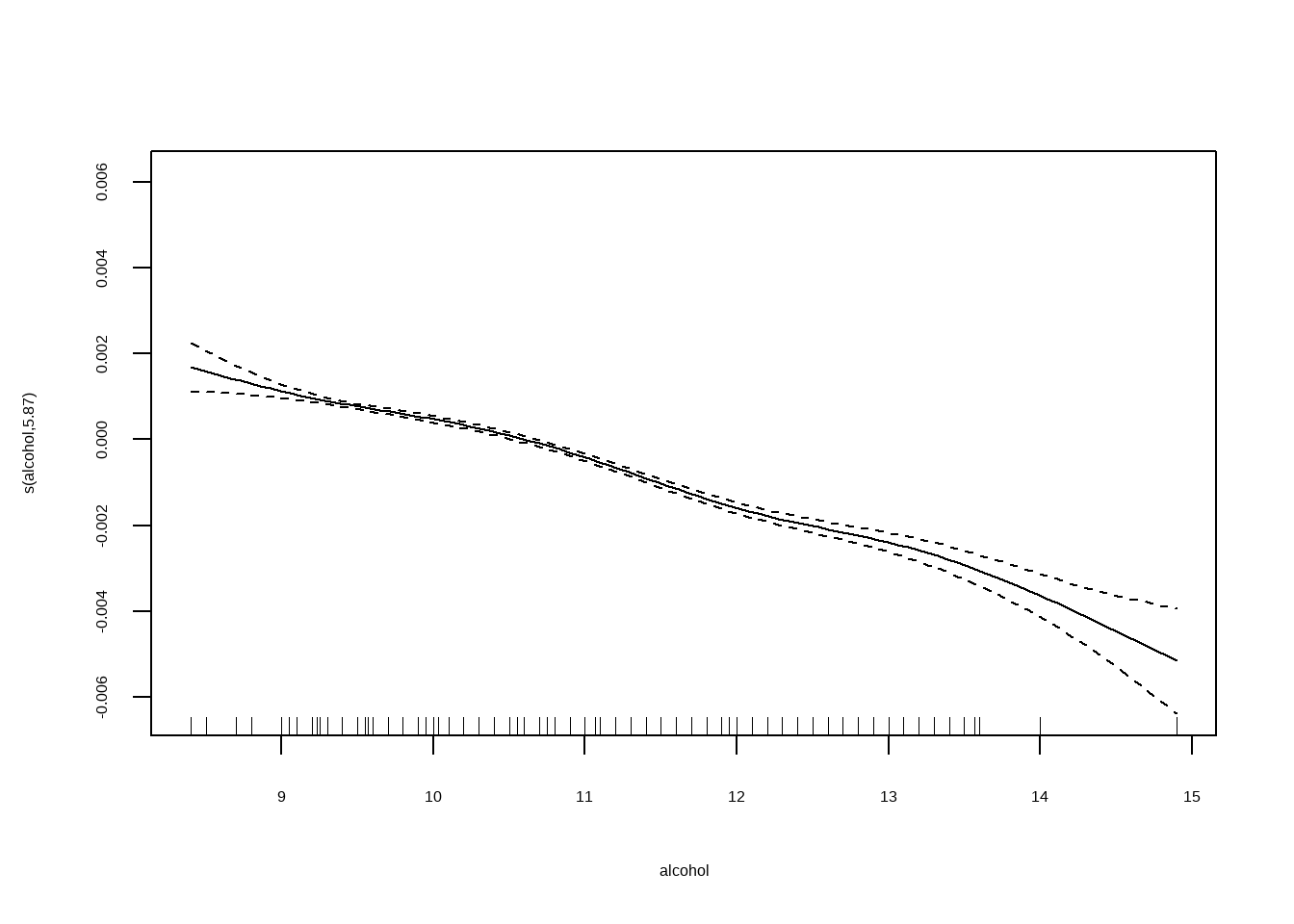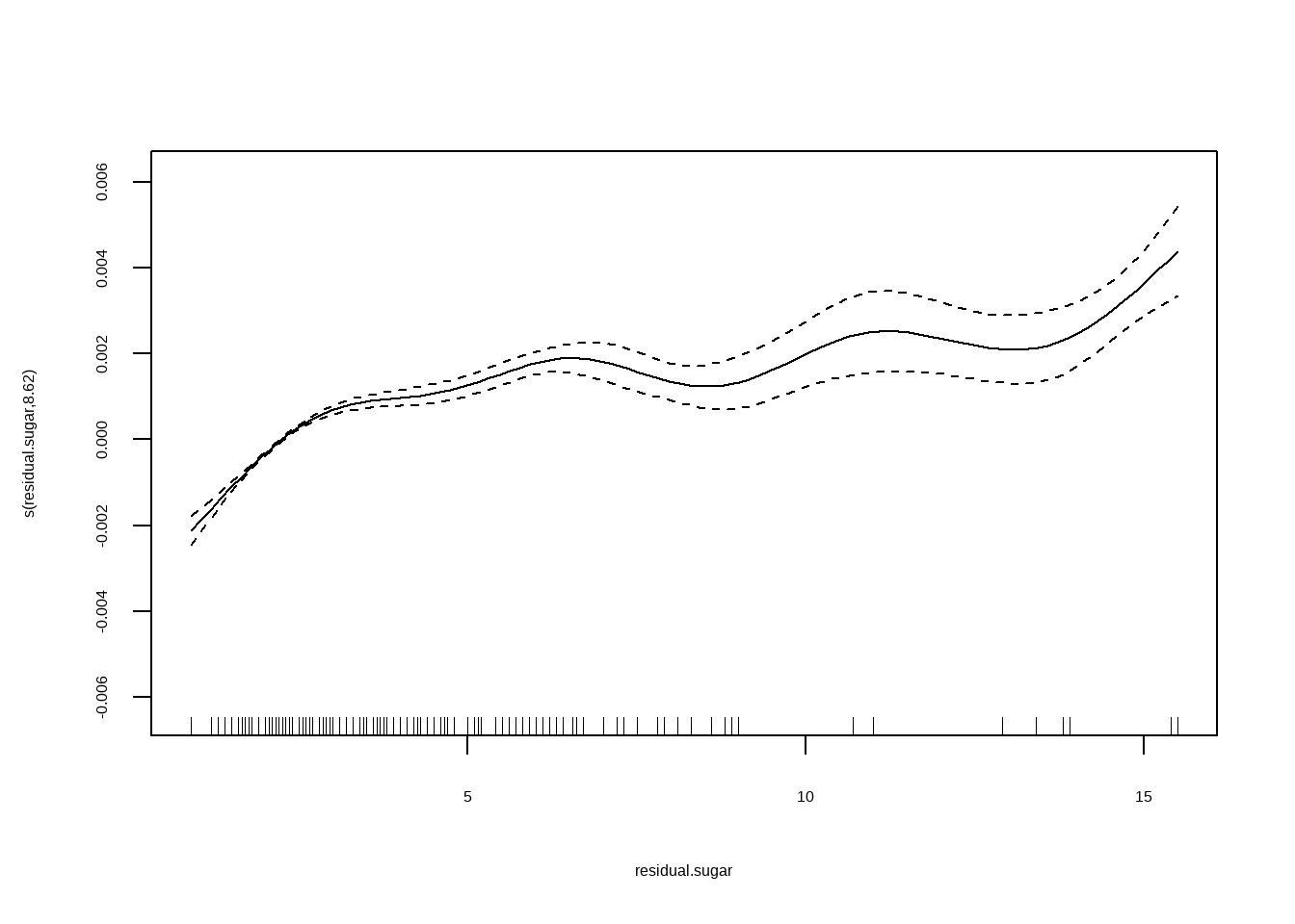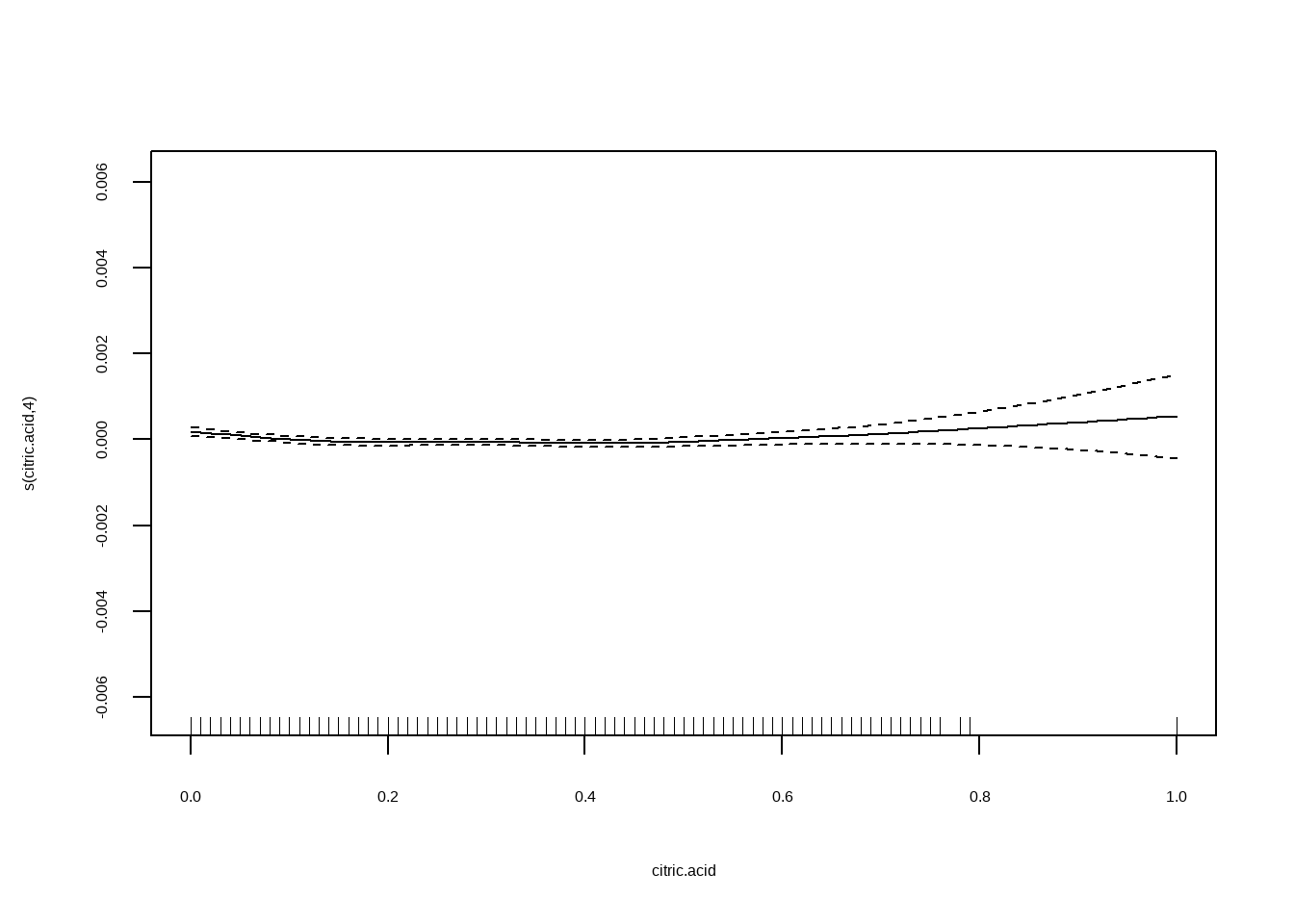 log(density) ~ s(fixed.acidity) + s(citric.acid) + s(residual.sugar)+s(alcohol), data=d)